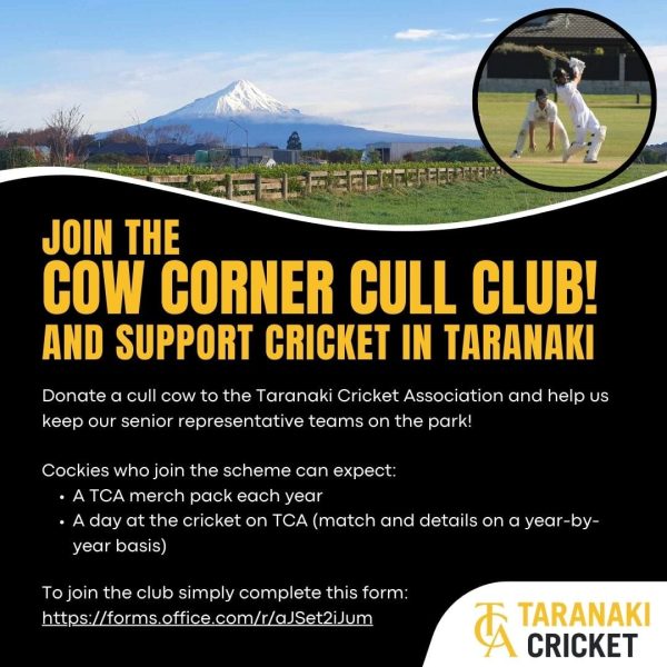 Farmers who donate a cow will receive a TCA merchandise pack ahead of next cricket season and a “day at the cricket” at Pukekura Park, on TCA.